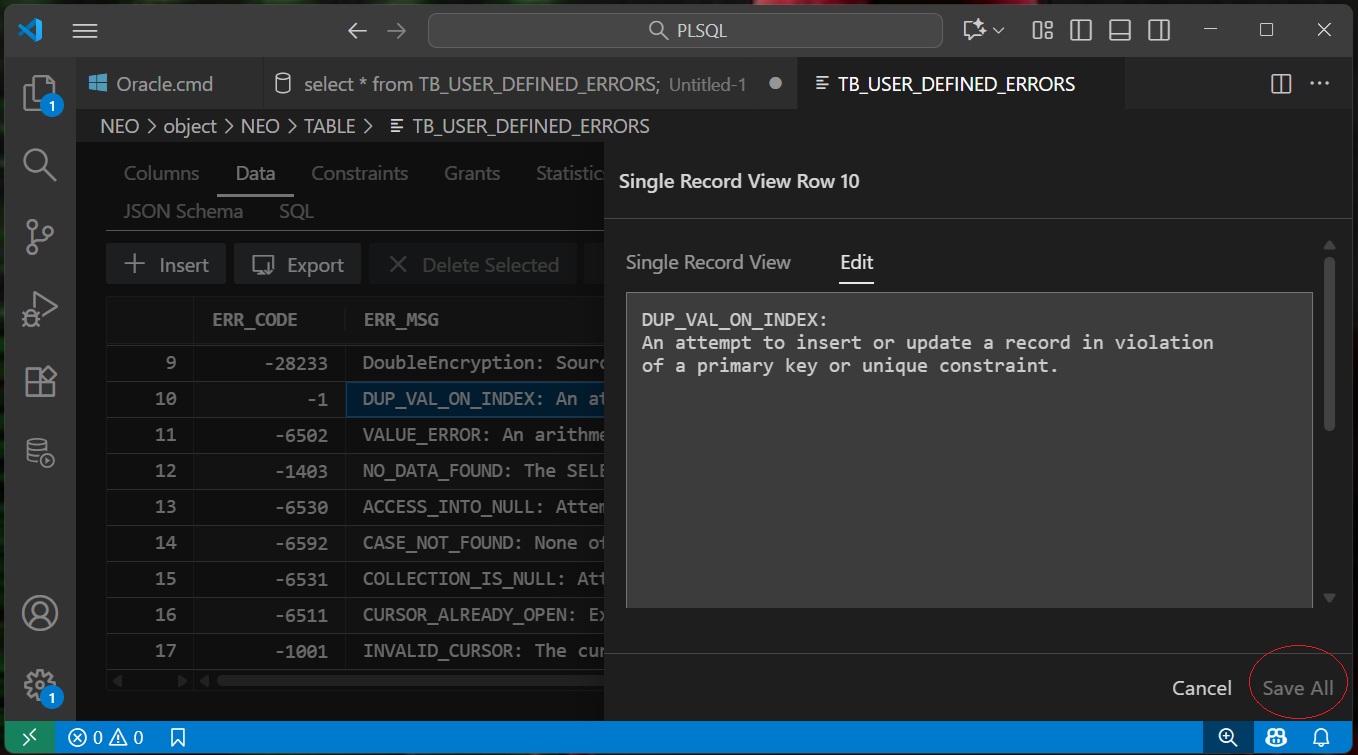 Immediately the Save All action is disabled, as circled in the image. VARCHAR2 changes CANNOT be saved as it does not have CANCEL, SAVE buttons as does NUMBER type.