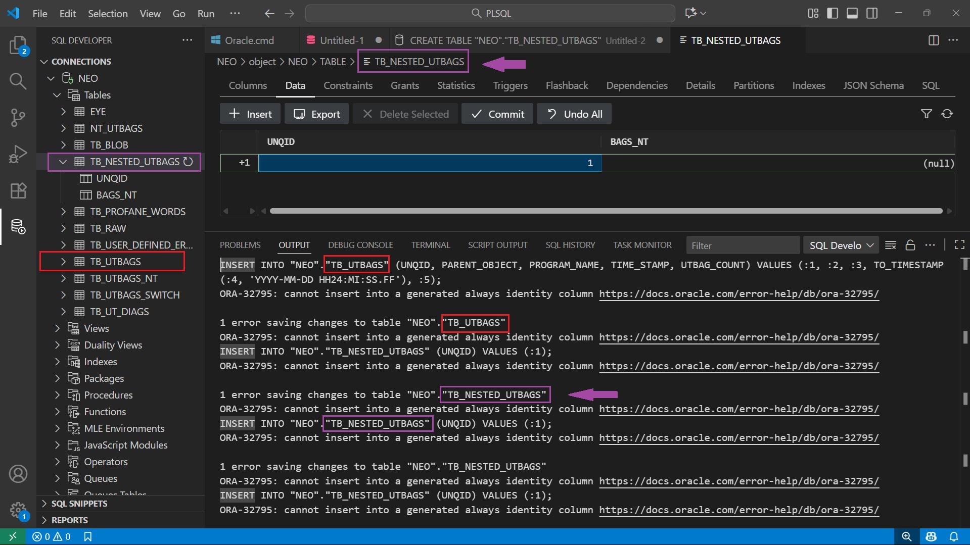 SQLDEV should block me from entering data into column UNQID given it's GENERATED ALWAYS declaration.