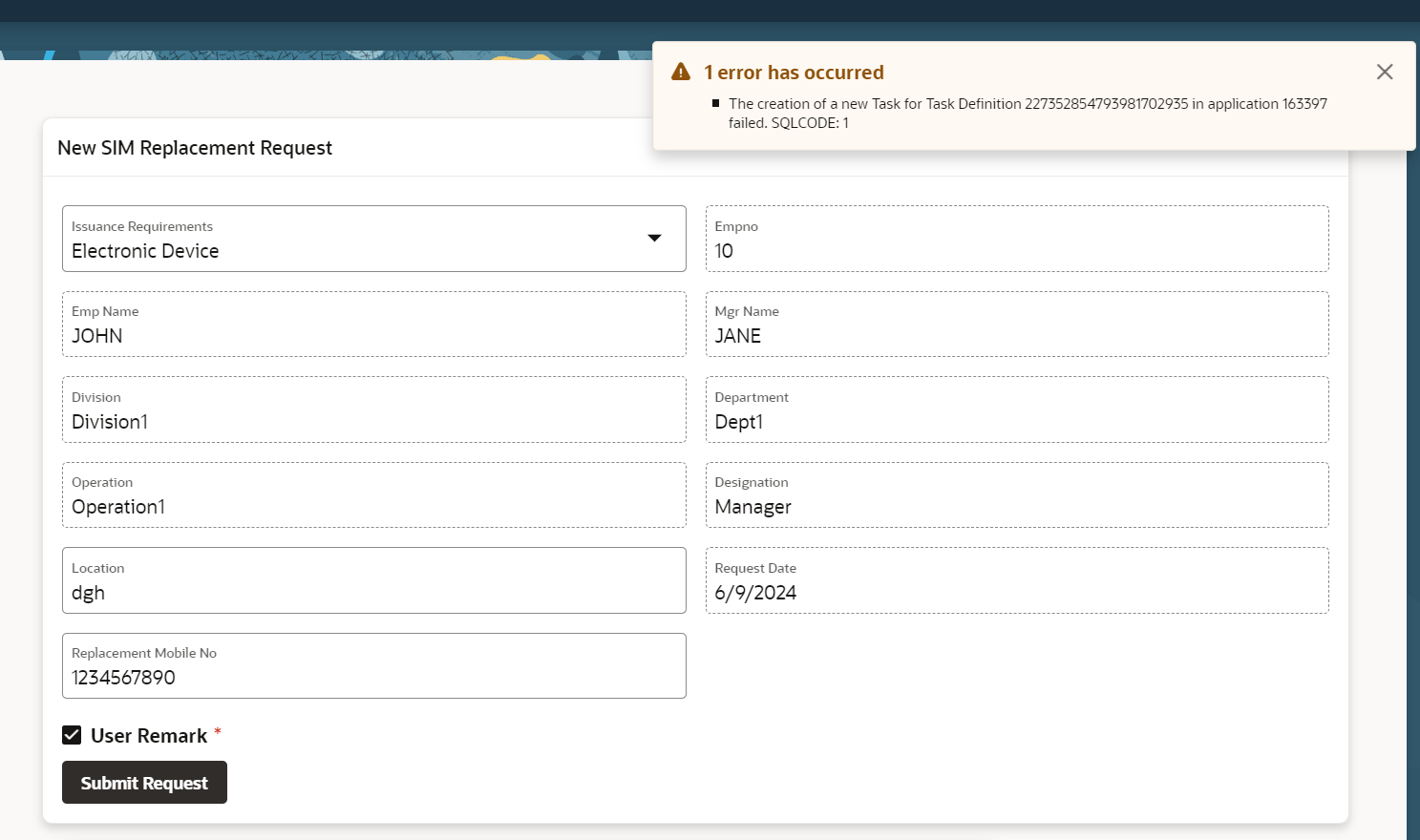 I am encountering an issue specifically with the SIM Replacement/Damage application. When I submit the form, I receive an error indicating that the task was not created. The error details and the debug report are as follows:
