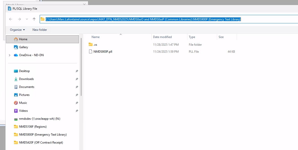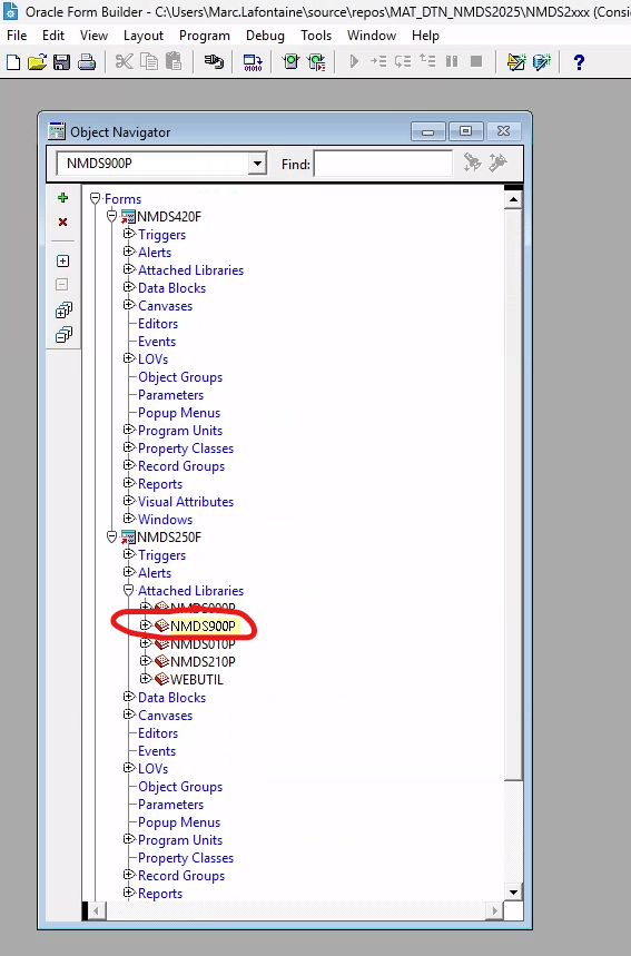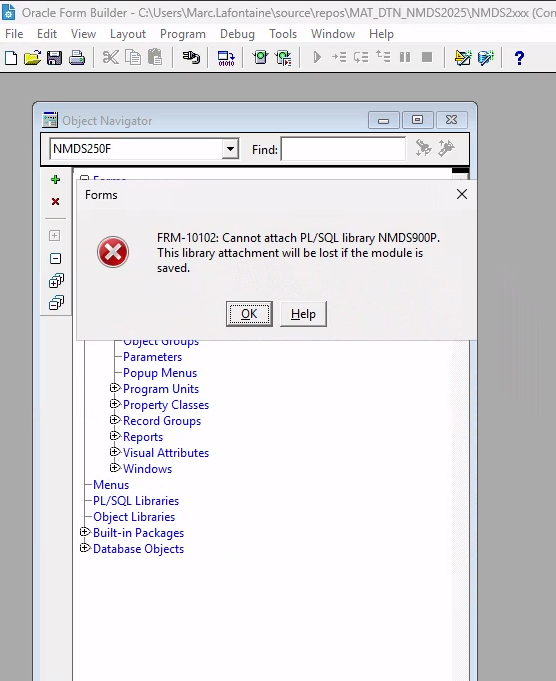 I'm using Oracle Forms 12c. I attached a library to a form. The PLL is in my User Profile (Windows 11), (C:\Users\Marc.Lafontaine\source\repos\MAT_DTN_NMDS2025\NMDS0xxO and NMDS0xxP (Common Librairies)\NMDS900P (Emergency Text Library))