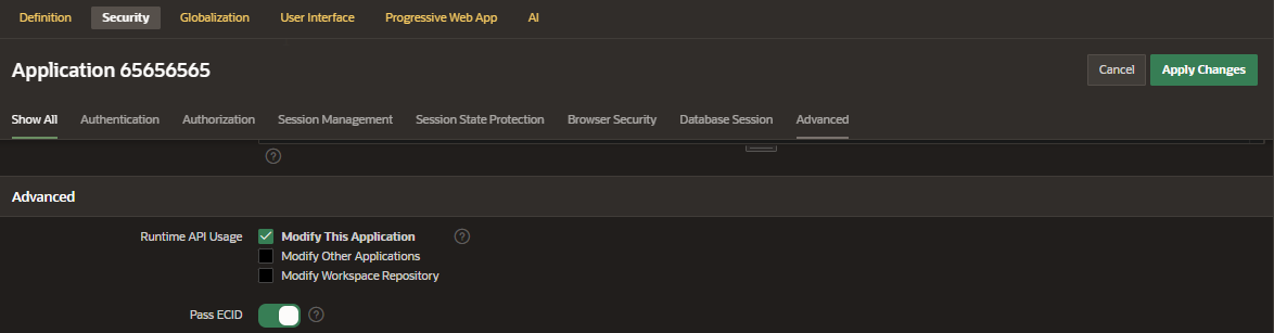 Shared Components β Security Attributes β Advanced β Runtime API Usage