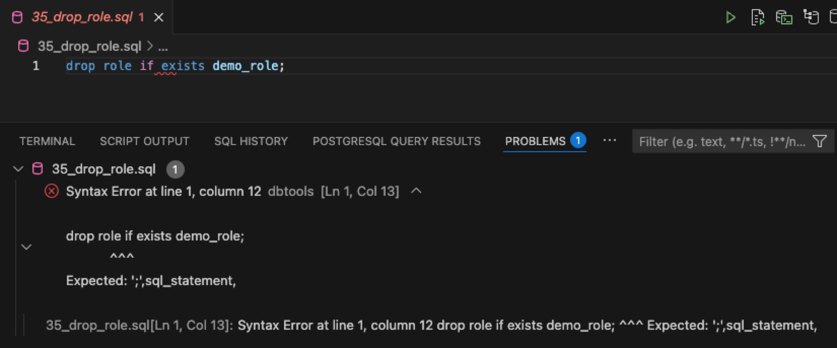 It looks like the Parser in the VS Code extension does not understand the DROP ROLE IF EXISTS