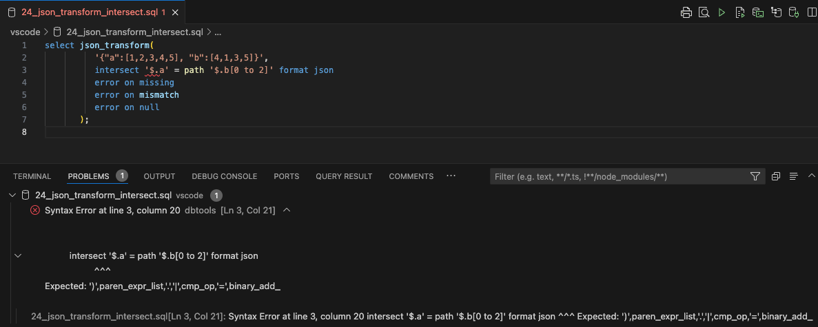 The following statement works in Oracle Database 23ai but produces a syntax error in the VS Code extension 24.3.1.