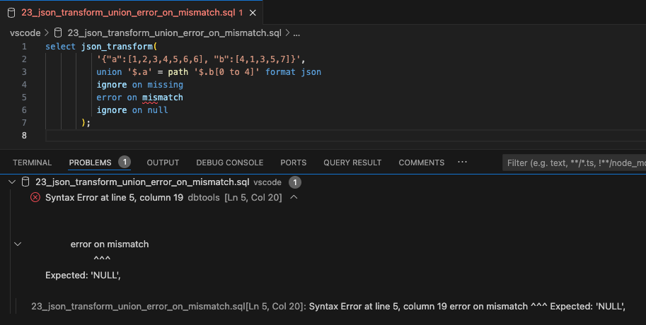 The following statement works in Oracle Database 23ai but produces a syntax error in the VS Code extension 24.3.1.