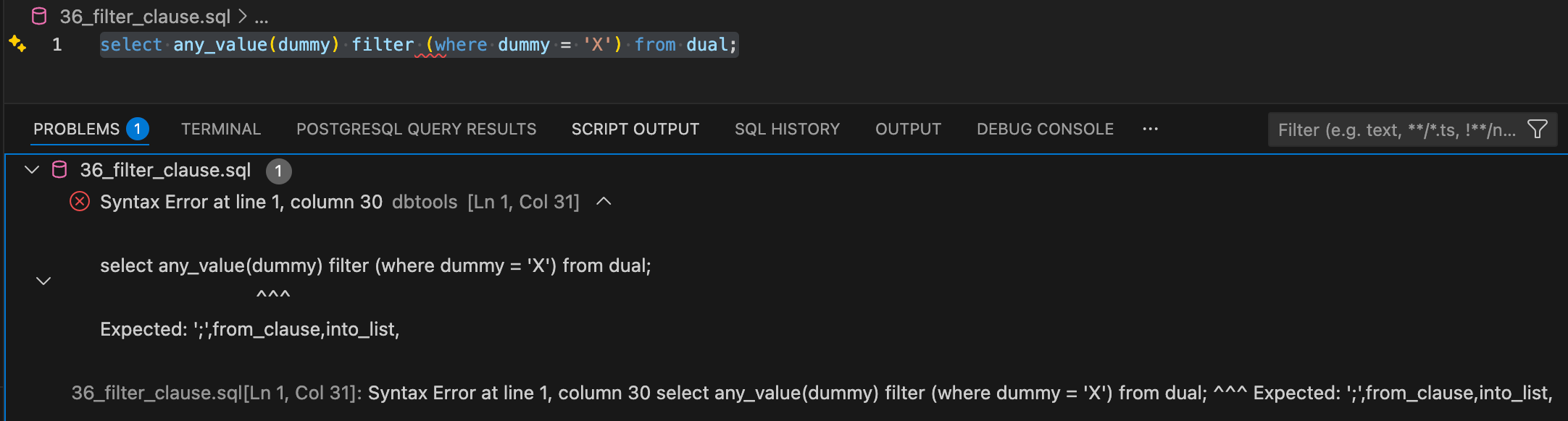 The next script can be saved, e.g., as “test.sql,” and successfully executed via SQLcl or SQL*Plus connected as any user. It also works via “Run Script” in VS Code. However, it produces a syntax error in the VS Code extension 25.4.0, which is shown in the PROBLEMS tab.