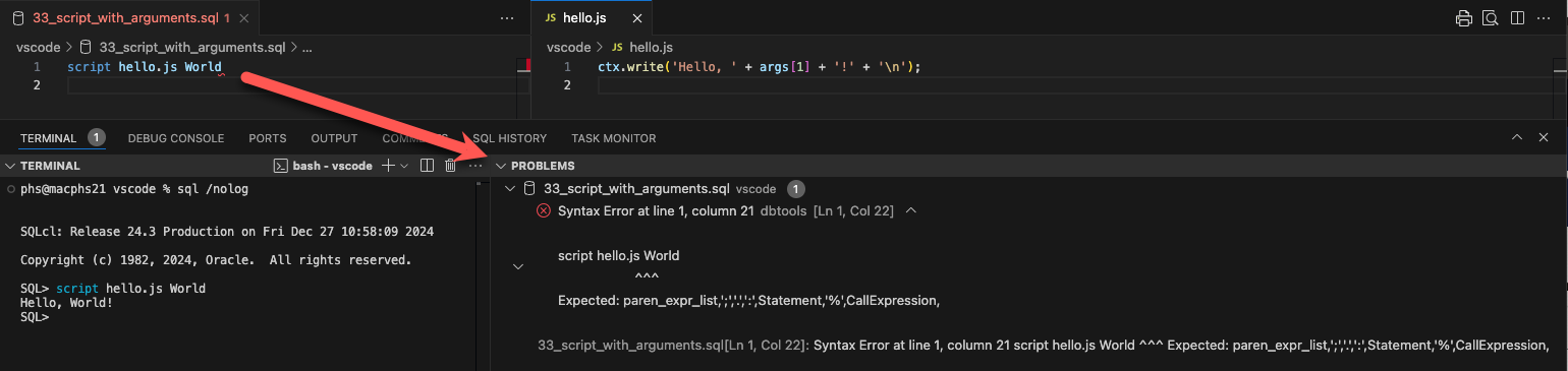 Here's the screenshot showing a syntax error when using the script command with arguments in SQL Developer Extension for VSCode 24.4.1: