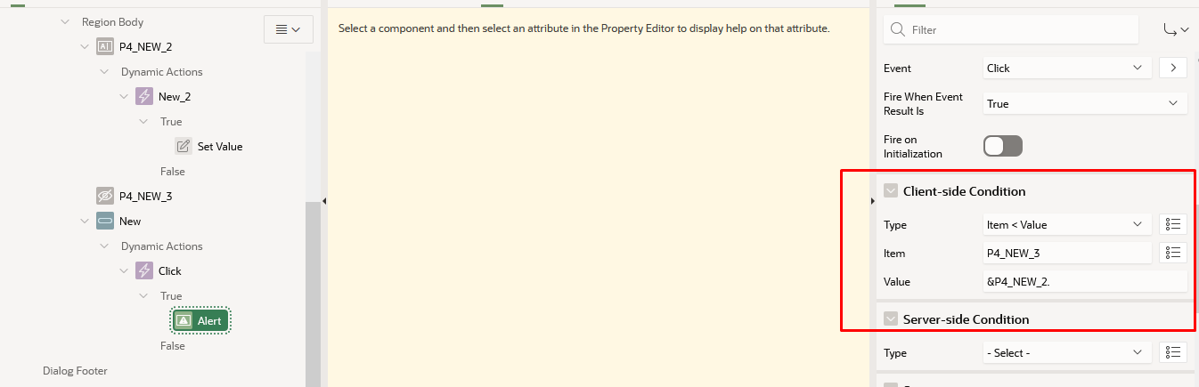 On another application with Apex 21.2.8, the button does not execute anything if i only but de client-side conditioned Alert. On console in debug mode not even the log of the DA execution is shown in that version.
