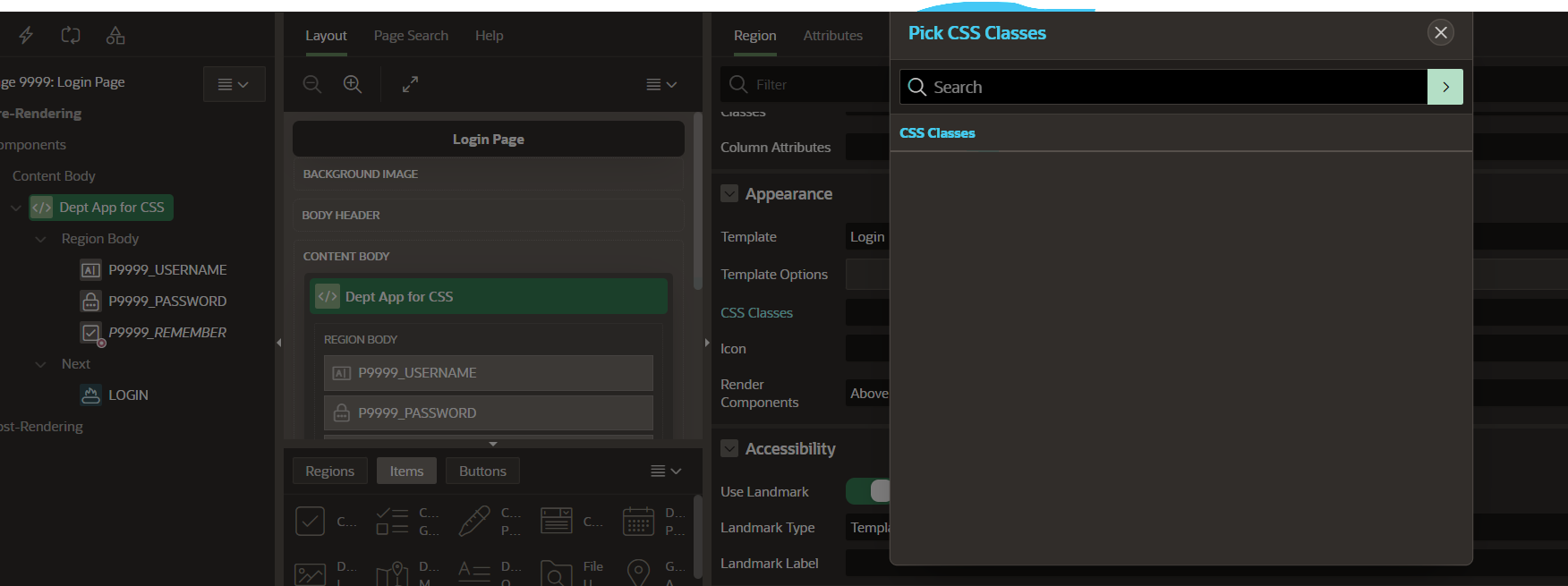 I am expecting the region class to appear in the search dialogue, but it is empty , so I cannot get to select the class.