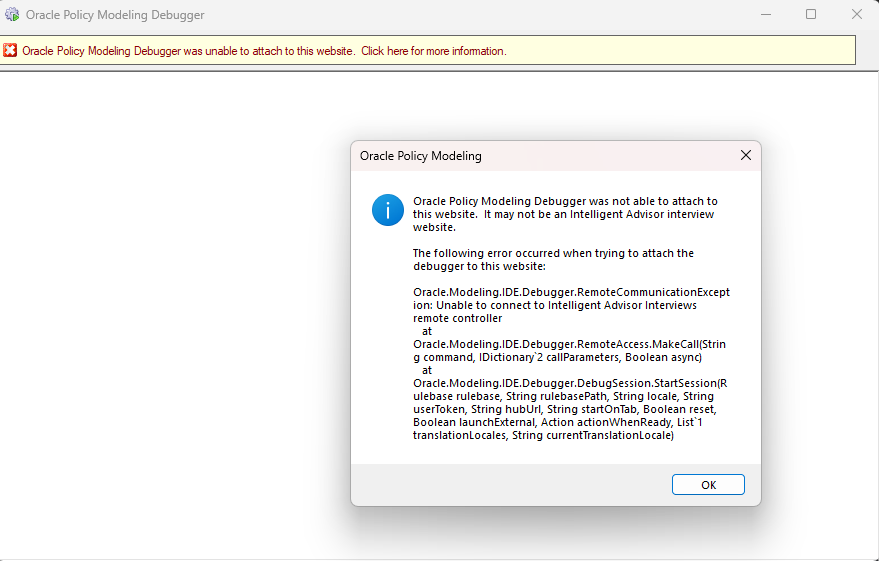 When attempting to run the debugger in OPM 21D for a large project I am met with the error below I have tried several other smaller projects and the debugger runs just fine. I have tried everything in the support documentation including:
