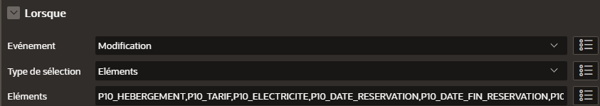 Under Oracle APEX 24.2.14, I have a form I want to recalculate the value of P10_TOTAL and regenerate it on the form each time anothers elements are modified. P10_TOTAL is a column in the table VE_RESERVATION I have created a DA with calculation of :P10_TOTAL: