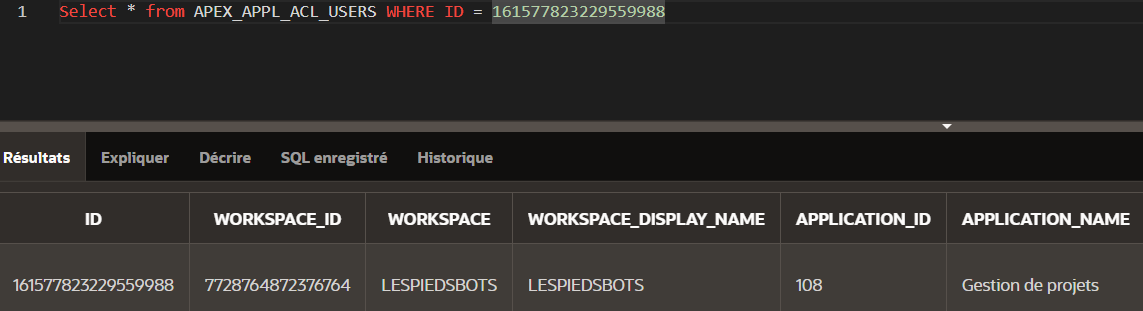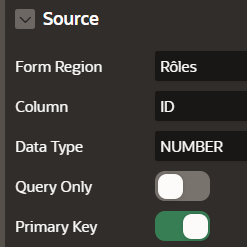 Under Oracle APEX 24.2.9, I have a region type FORM on the view APEX_APPL_ACL_USERS which is initialised by a form Initialisation process on before header position. The primary Key is defined in the item P11_ID_1, type Text (if I declare type Number, I get an error message “Number not valid”, strange…) declared as PK, and containing the value 161577823229559988. Source is the the column ID in the view APEX_APPL_ACL_USERS.