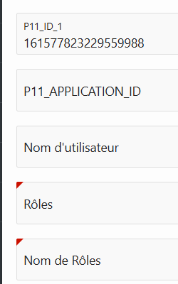 What happens in that the fields of the form are not filled when I run the page 11. P11_APPLICATION_ID, Nom d'utilisateur, Rôles, Nom de Rôles :