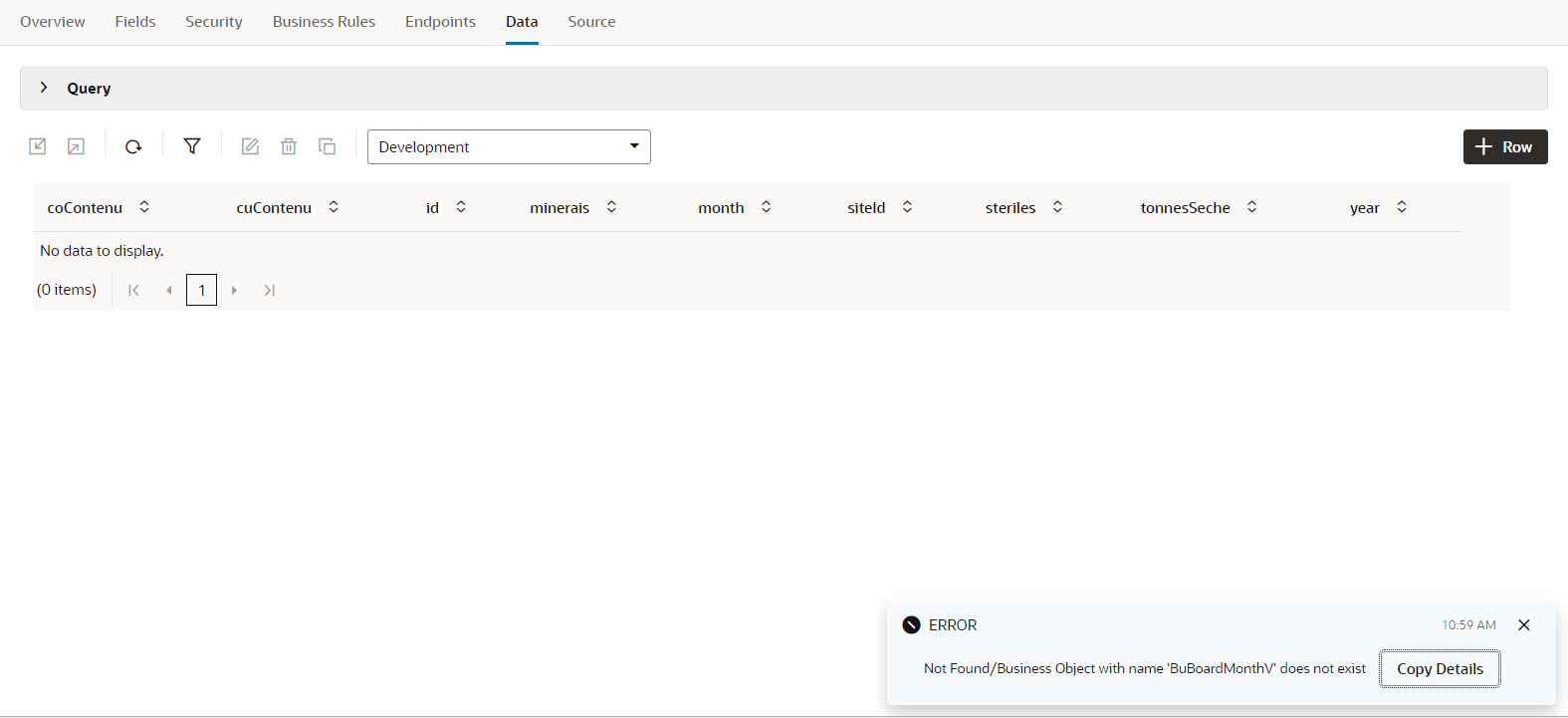 The error appear when i create a BO from sql view. I delete the BO and i try to create it again: the process of creation ends but in tab data this error appear: