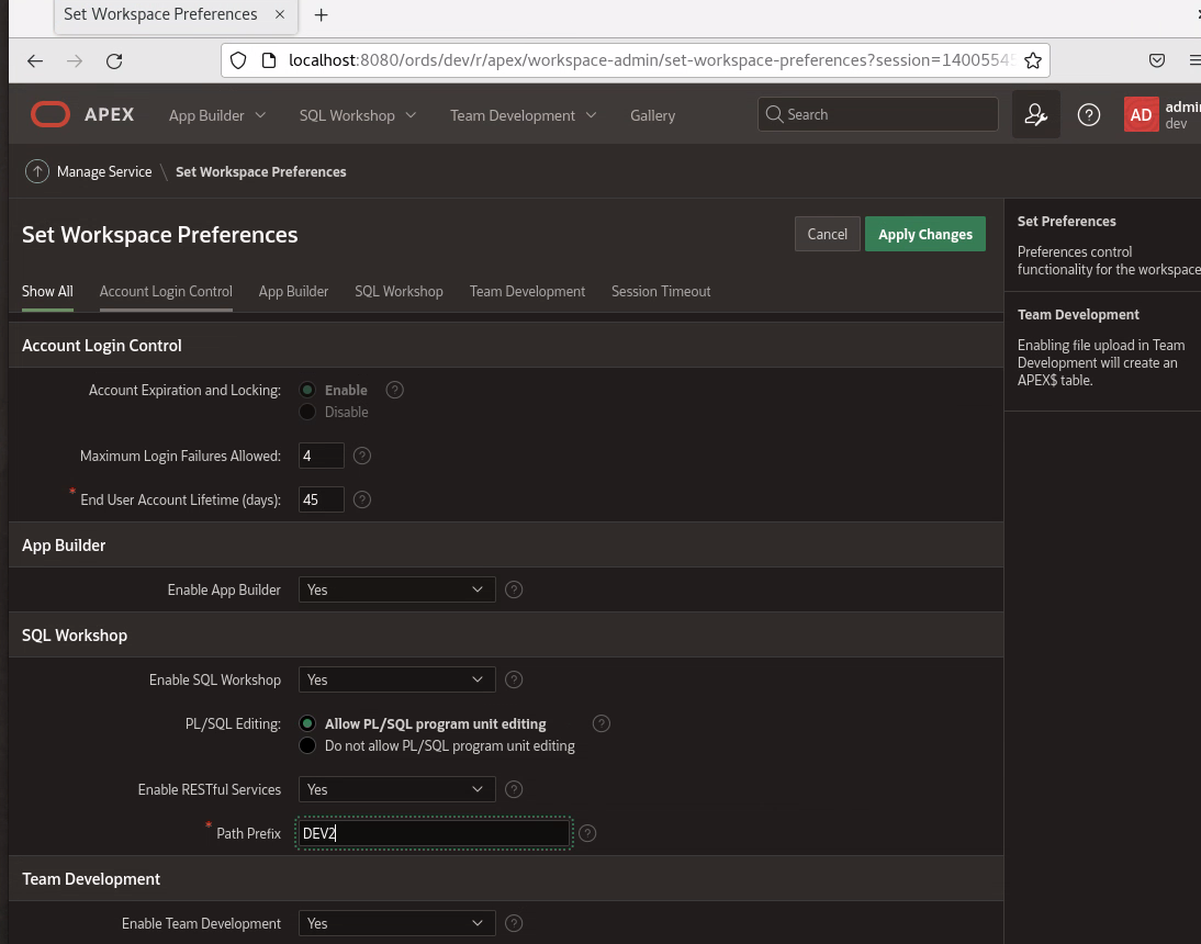 Then I go Manage Service->Set Workspace Preferences and change Path Prefix from DEV to DEV2.