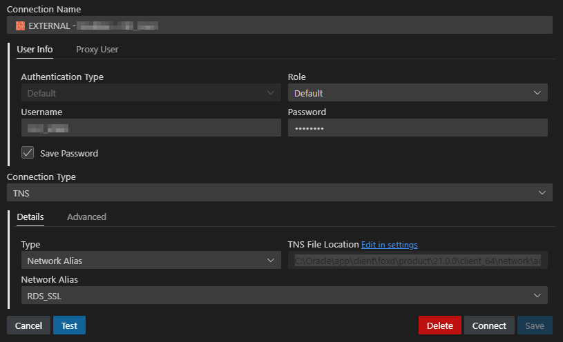 We have an external database that is setup to use SSL encryption and the traditional oracle wallet process. When are able to connect when using Legacy SQL Developer, however the same connection fails when using the VS Code Extension (even in 25.3.2). Can we add support for SSL connections?