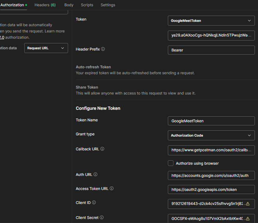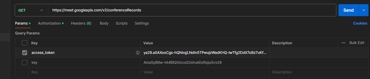 I'm trying to test Google Meet APIs using Postman application. I've tested all APIs available for Google Meet in Google Cloud Console as shown below: