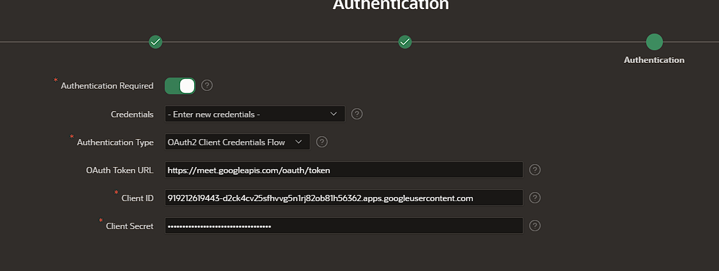 The type was (OracleREST data source) not Simple HTTP, and the (URL End point) the same value as in Google Meet REST API page
