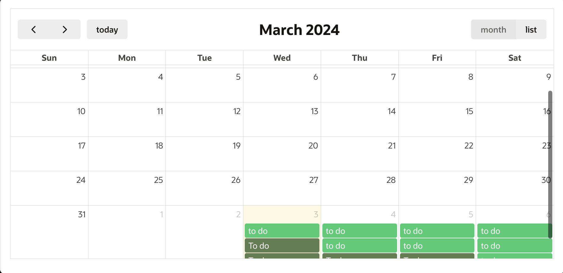 I created the page with a left-side column, and I added a calendar region to the body. I have 10 ToDo tasks each day. The issue is that I want to disable the scrollbar, and I want the calendar to automatically increase its height according to the data.