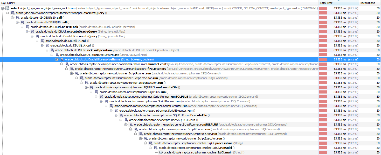 In this case, the JDBC profile shows that this query (called by the oracle.dbtools.db.OracleUtil.resolveName method?) is run when processing the errors (SHOW ERRORS) after compiling PL/SQL objects.