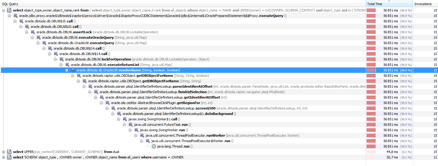 In the case of the above-mentioned post, where the same SQL id (cgky22310n1hg) was possibly causing slowness, using @User_2DKLA's way of reproducing the background activity, the JDBC profile (using SQL Dev 21.4.3 here) is different, with the bottom of the stack hinting that SQL Dev is attempting to resolve names in a background Java thread for the sake of providing the user with richer information about names in the PL/SQL block…