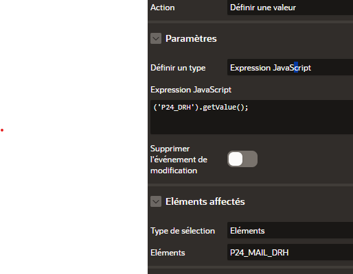 Under Oracle, I want to affect the new value of an item P24_DRH type LOV to another element P24_MAIL_DRH.
