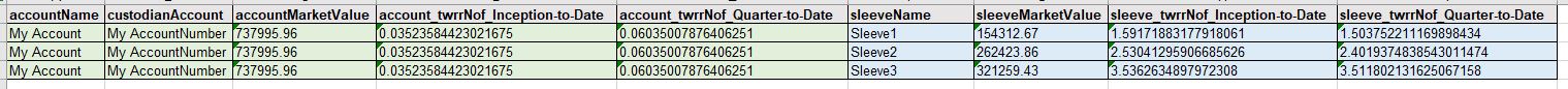 Same like account level performance, I have kept only 2 columns here for simplicity purpose , but there 8 different performance number for each sleeve, so when we read value for twrrNof, we also need to know which time period it is for, for example mapping it with periodLabel='Inception-to-Date' means this twrrNof value is sleeve_twrrNof_Inception-to-Date.