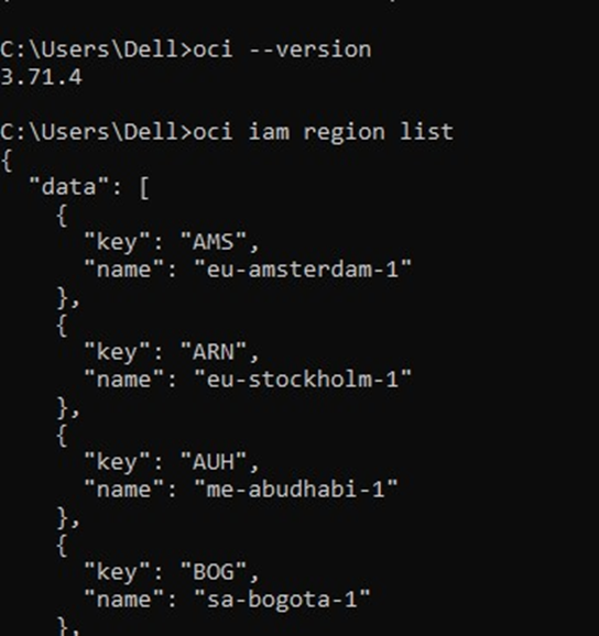OCI CLI successfully authenticated using IAM API signing keys and retrieved OCI service data, confirming secure and functional connectivity between the local Windows system and Oracle Cloud Infrastructure.