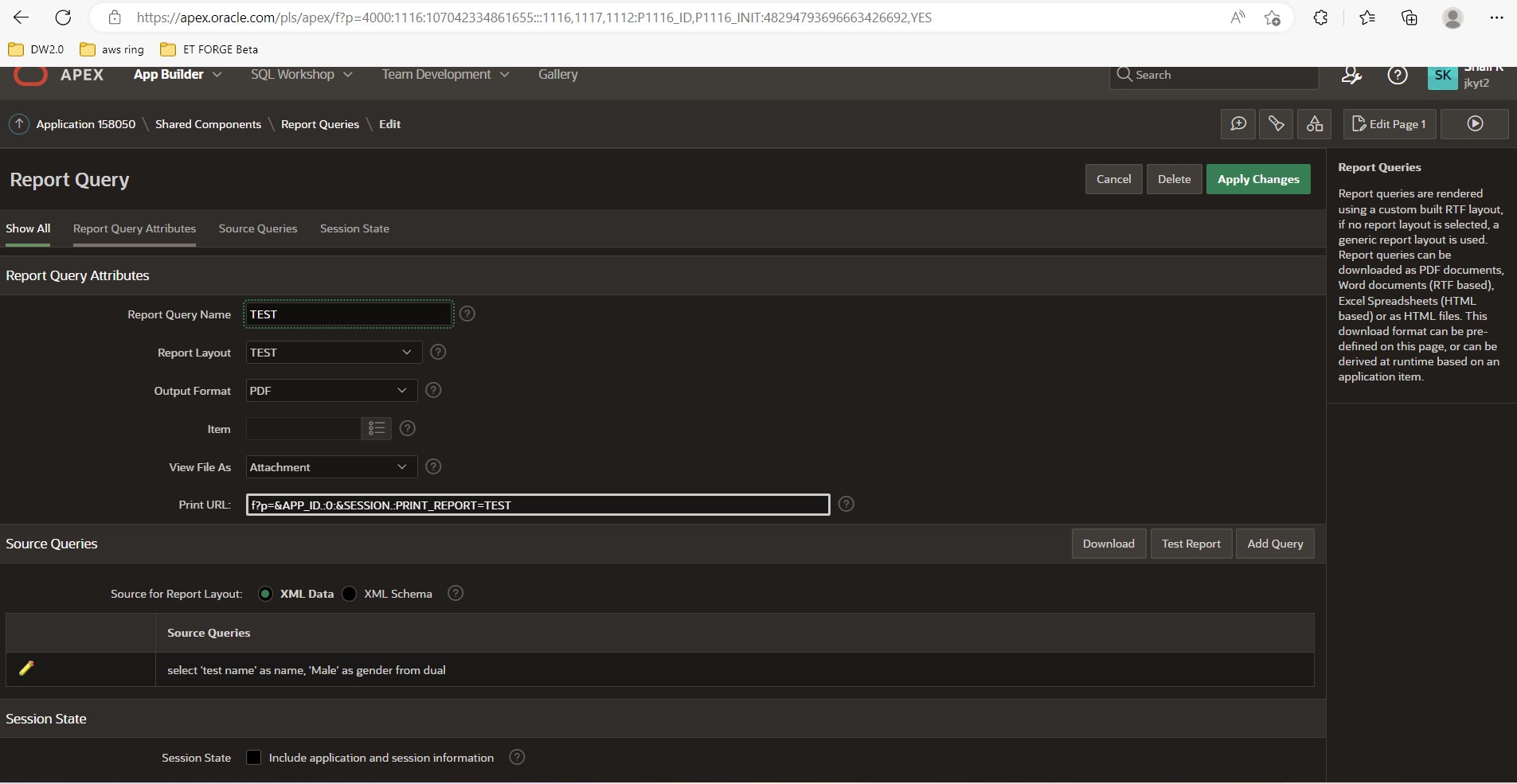 I have created a very simple sample test query in 'Shared Component' as show in screenshot below on apex account (free workspace). However when ever I am testing report it is going into error.