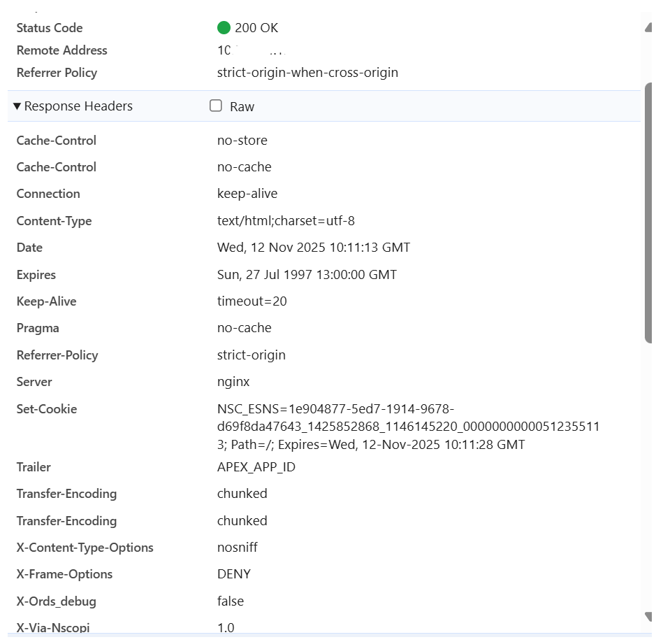 After upgrading to ORDS 25.2.1, the APEX layout breaks and some cookies (e.g., NSC_ESNS=...) are displayed directly in the page body instead of being handled as HTTP headers.
