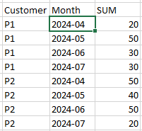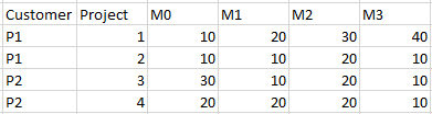 Making the sum for the M0 to M3 grouping by Customer is simple, but replacing the M# with a tag for the month have left me without any idea.