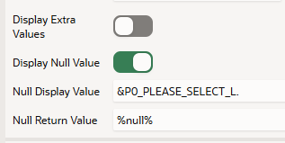 I used to use the select2 plugin in my application and i set the null display value to be a page 0 item called P0_PLEASE_SELECT which has a value of “Please Select”