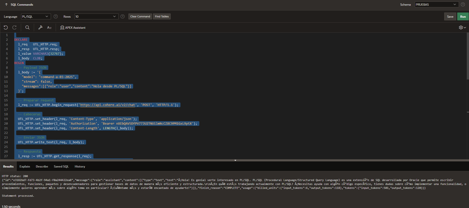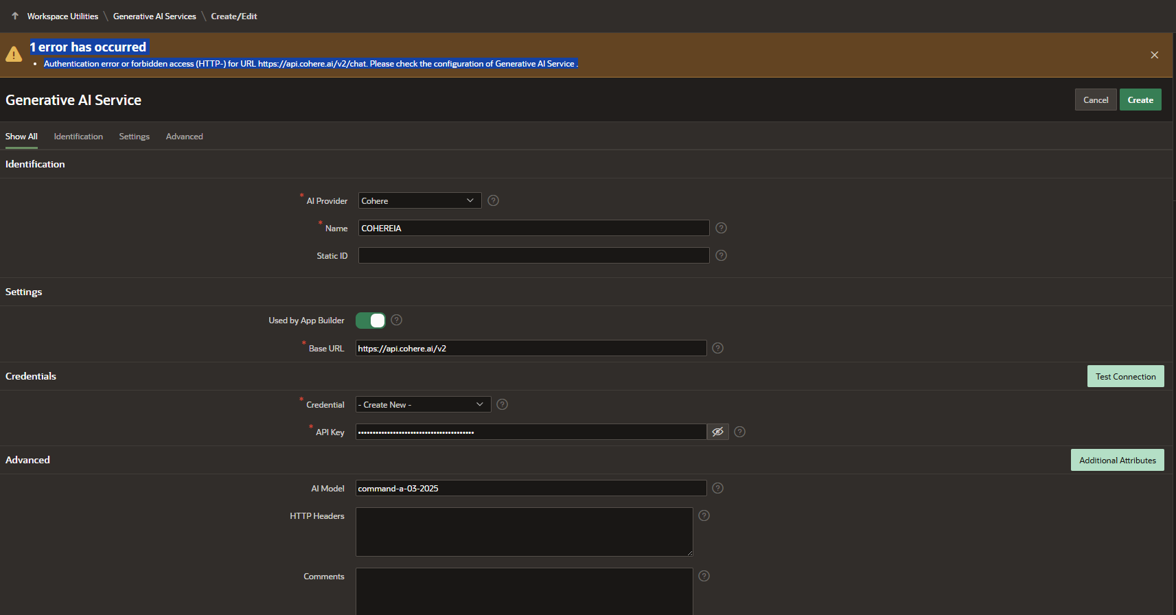 I ALREADY REMOVED THE COHERE SECRET KEY, BUT I DON'T KNOW WHY IT'S NOT WORKING. IT SHOULD BE THERE, READY TO USE. THE PL/SQL BLOCK WORKS FOR ME. SQL BLOCK WORKS, SO THAT CONFIRMS THAT MY USER DOES HAVE A CONNECTION TO COHERE, BUT WHEN I TRY TO USE IT WITH THE APEX ASSISTANT, IT DOESN'T WORK. DOES ANYONE KNOW A SOLUTION?