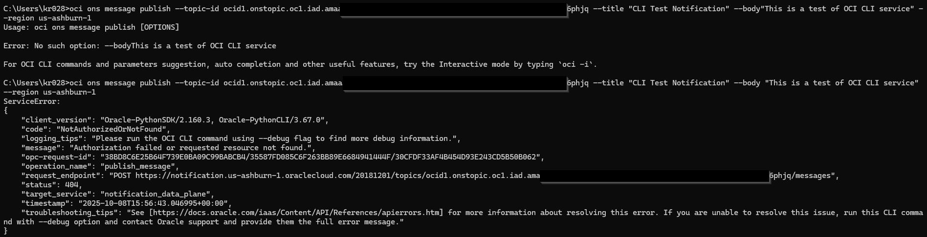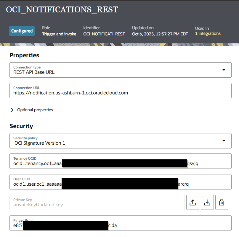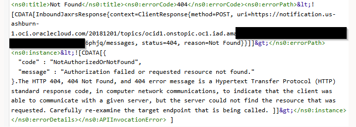 Hello - I am wondering if anyone has successfully setup the OCI Notification Service for use with an OIC Integration? I am looking to generate an SMS text message from an integration utilizing the OCI Notification Service. I believe I have done all the necessary setups in both OCI console and OIC, however I am getting 404 errors (NotAuthorizedOrNotFound) when I try to make the REST call from either OIC or from the command-line utility (oci-cli).