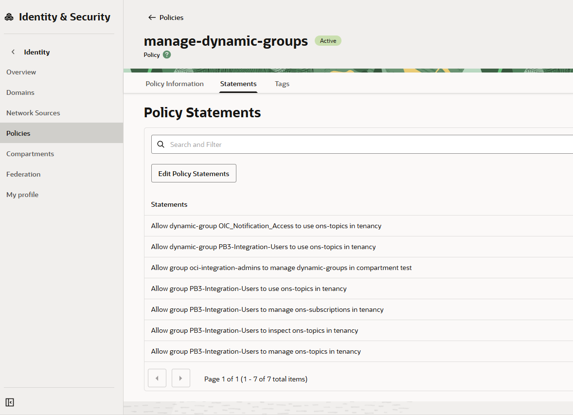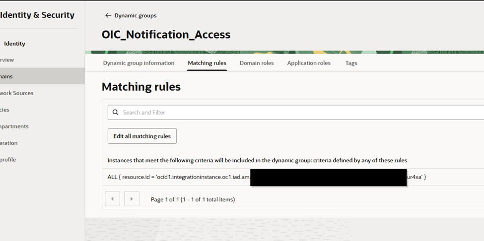 Created Dynamic Group in the OracleIdentityCloudService domain in root compartment and assigned matching rule with OCID from OIC test instance (tested with both Dynamic groups and user groups below in the policy thinking that this was the issue):