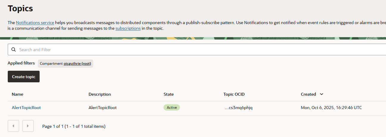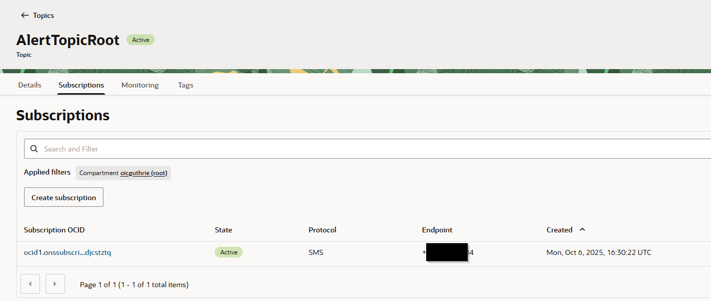 Created Topic and SMS Subscription, then confirmed the SMS subscription in the root compartment: