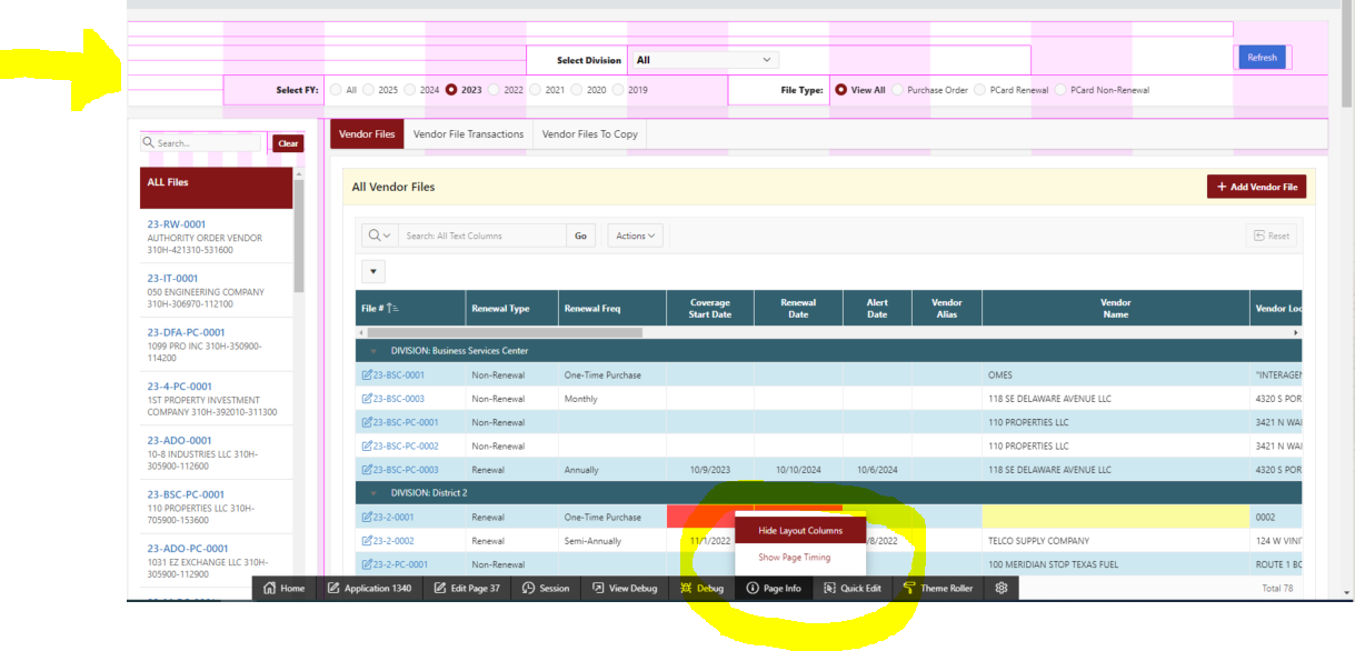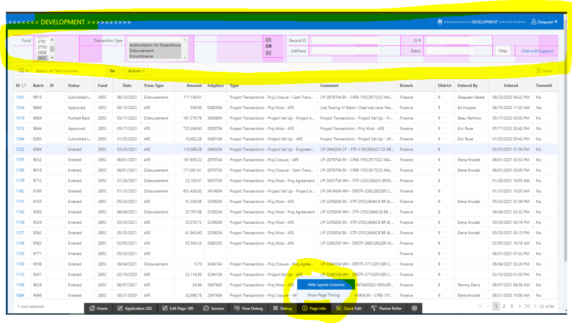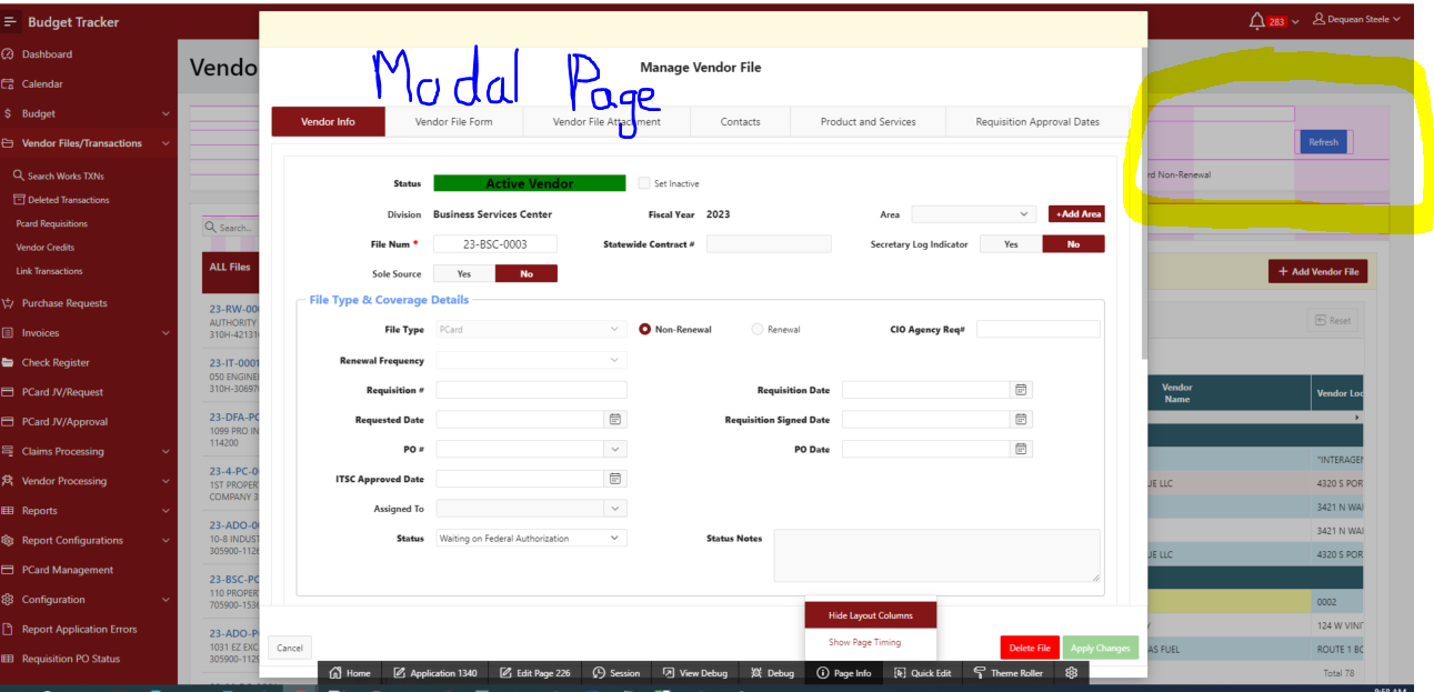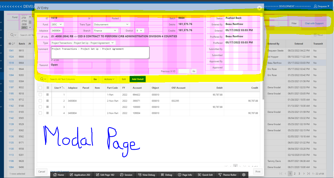 When I click on a Link that takes me to a Modal Page of the Parent Page Above the White and Pink Columns for the Show Layout Columns do not appear, but on Univeral Theme 42 1.1 the White and Pink Show Layout Columns do appear on the Modal