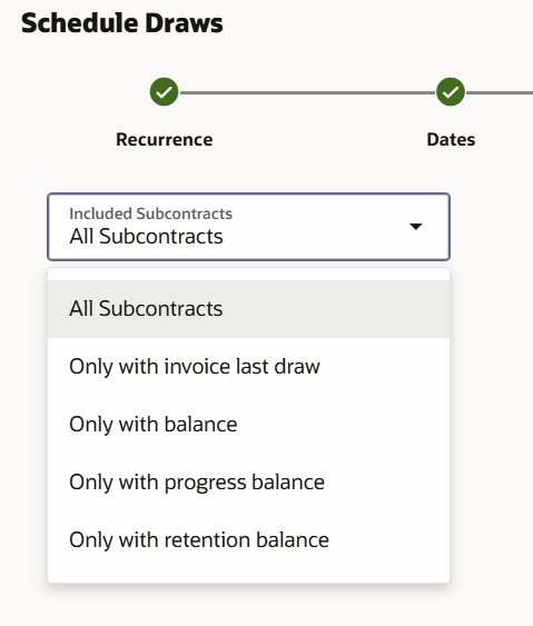 I would love the option for there to be a “specify subcontracts” where you could then manually add draw participants. There are situations in phased projects where not every subcontract is applicable for a phase/draw. Being able to specify this will make the schedule draws feature able to be used on those projects and miss delays from manual entry. If this were completed, then our team would be able to schedule draws regardless of complexity and be able to have it setup one time rather than missing a draw participant and resulting in a late bill submission. This would save time each month from manually specifying each participant on a multi-phase job. In its current form, it is un-usable for these multi-phased complex projects.