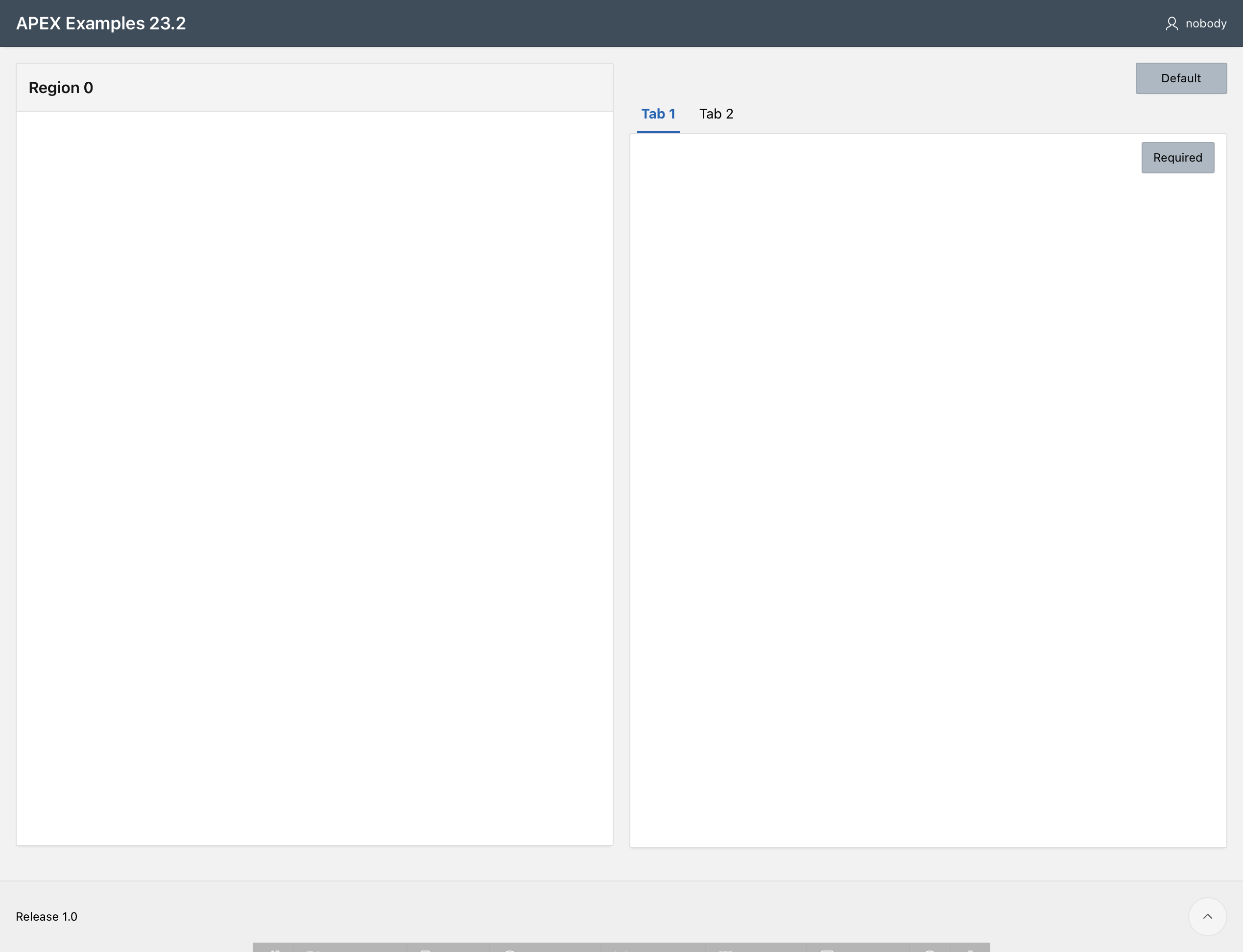 Page layout consists of a static region on the left, and two tabs on the right. On occasion Tab 2 will be hidden by a server-side condition. To ensure a consistent appearance and the display of the Tab 1 link as a heading in that scenario, the tabs are implemented using a Tab Container rather than a Region Display Selector.