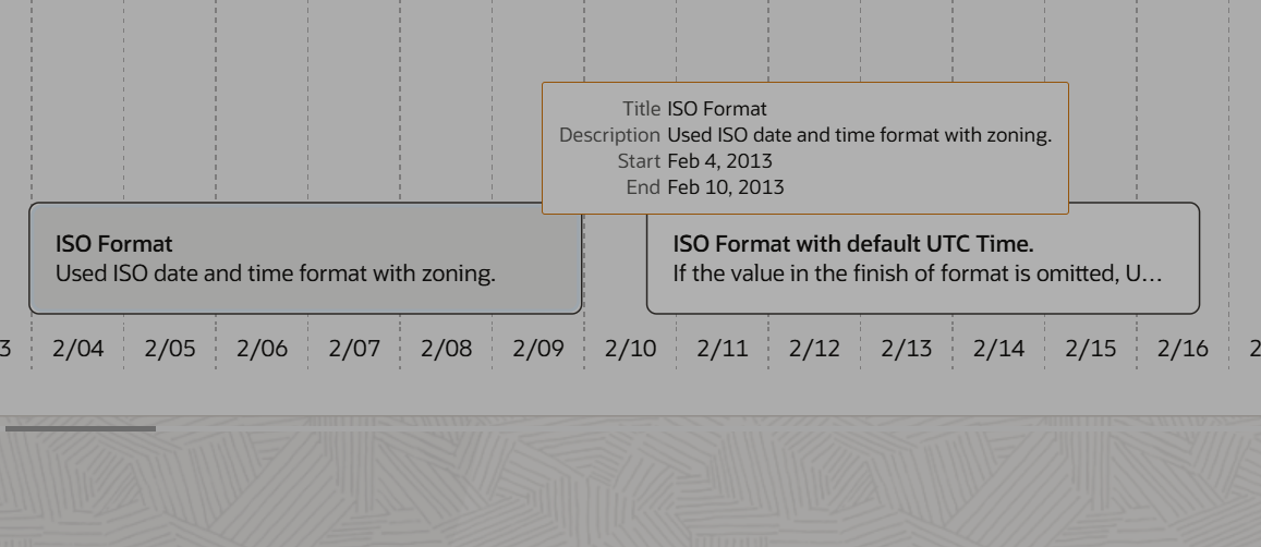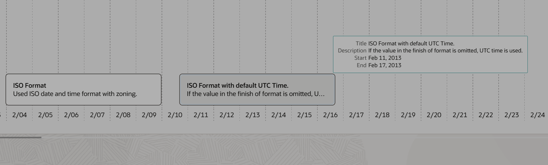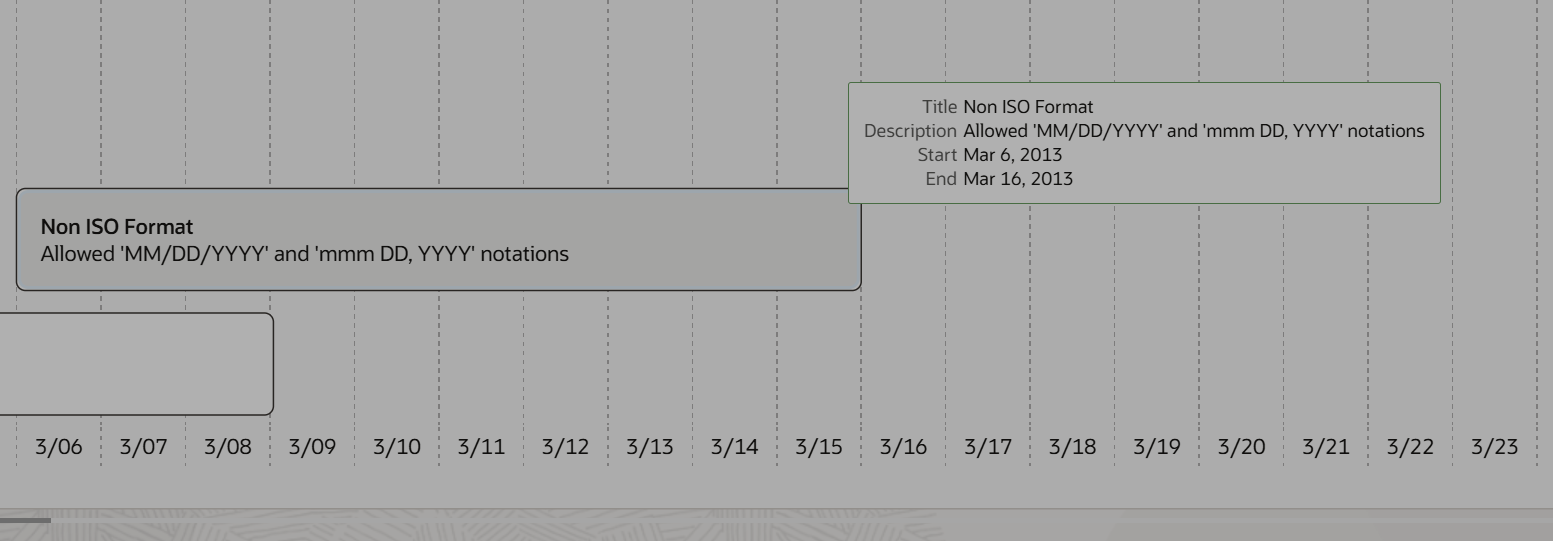 Note that depending on the format chosen (ISO or UTC), the tooltip may show the correct start and end date, however the placement on the x-axis is still wrong.