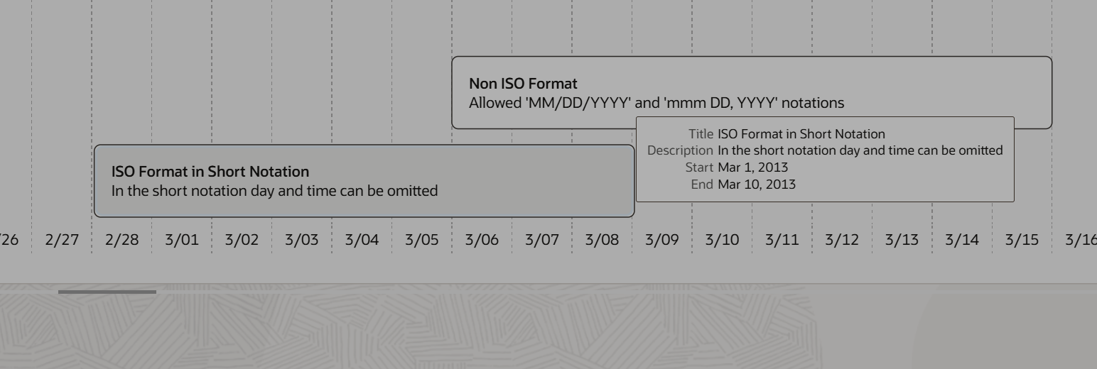 Consider the following example from the Oracle JET Cookbook: https://www.oracle.com/webfolder/technetwork/jet/jetCookbook.html?component=timeline&demo=dateFormatsTimeline