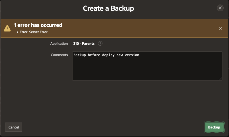 Application backup fails when creating manual application backup (Utilities → Manage Backups). The last successful backup was seven weeks ago.