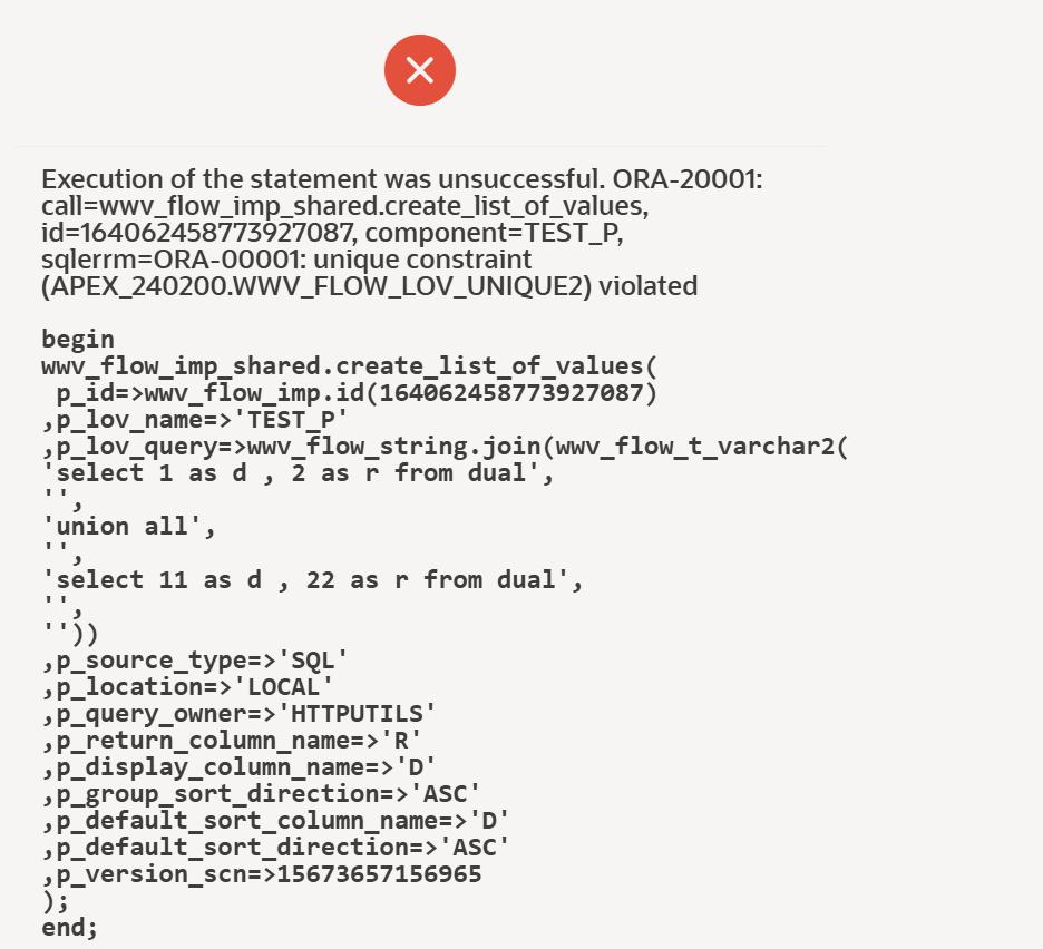 Execution of the statement was unsuccessful. ORA-20001: call=wwv_flow_imp_shared.create_list_of_values, id=164062458773927087, component=TEST_P, sqlerrm=ORA-00001: unique constraint (APEX_240200.WWV_FLOW_LOV_UNIQUE2) violated