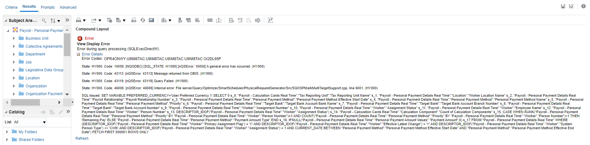 We are creating a report in oracle fusion OTBI for Personal Payment Method Top of Stack. We're having an error below every time we add the TRU (Tax Reporting Unit Name) field. This report have 2 Subject areas