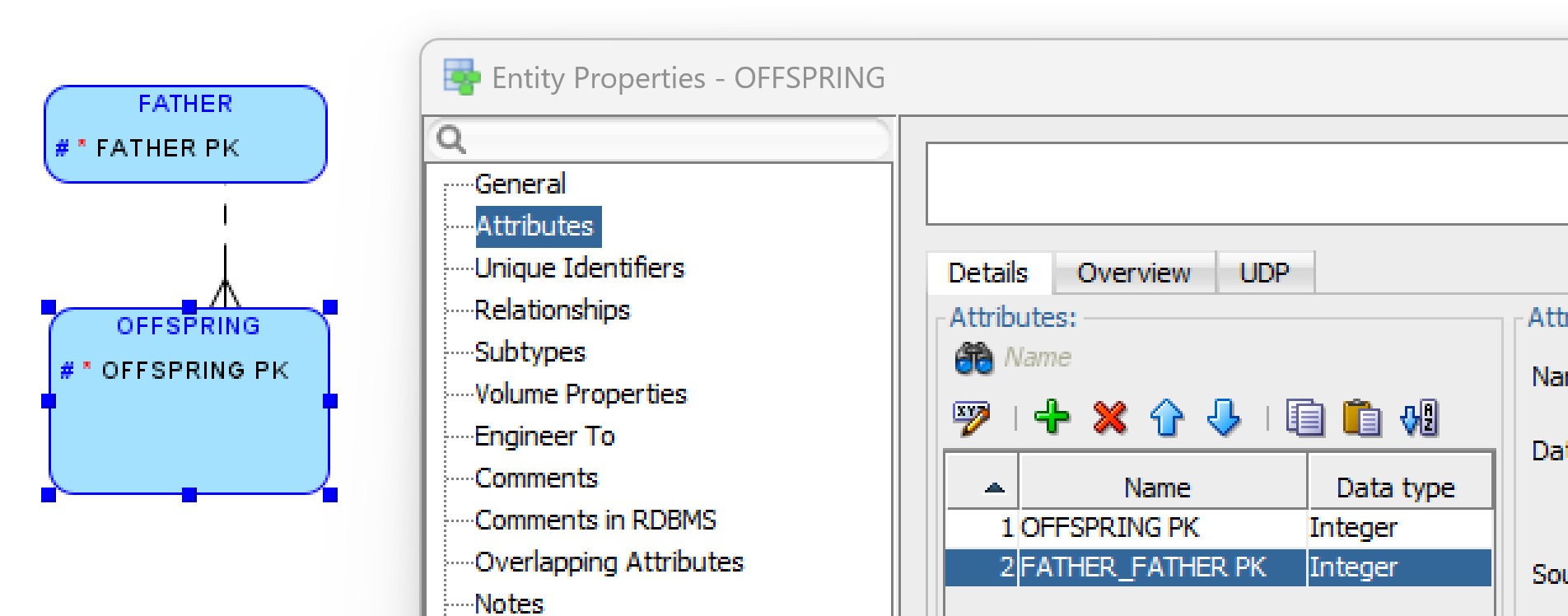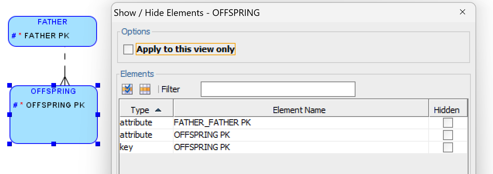 As you can see, attribute FATHER_FATHER PK is in the list of entity OFFSPRING's attributes, but not displayed on the diagram. If you bring the context menu up by righ-clicking on OFFSPRING and selecting “Show/Hide Elements” you will see that FATHER_FATHER PK is listed, and that the checkbox in the “Hidden" column is unchecked.