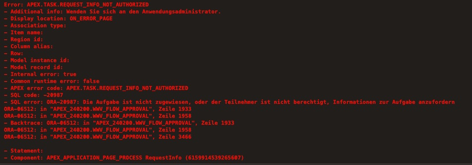- SQL error: ORA-20987: Die Aufgabe ist nicht zugewiesen, oder der Teilnehmer ist nicht berechtigt, Informationen zur Aufgabe anzufordern ORA-06512: in "APEX_240200.WWV_FLOW_APPROVAL", Zeile 1933 ORA-06512: in "APEX_240200.WWV_FLOW_APPROVAL", Zeile 1958 - Backtrace: ORA-06512: in "APEX_240200.WWV_FLOW_APPROVAL", Zeile 1933 ORA-06512: in "APEX_240200.WWV_FLOW_APPROVAL", Zeile 1958 ORA-06512: in "APEX_240200.WWV_FLOW_APPROVAL", Zeile 3466 - Statement: - Component: APEX_APPLICATION_PAGE_PROCESS RequestInfo (6159914539265607)